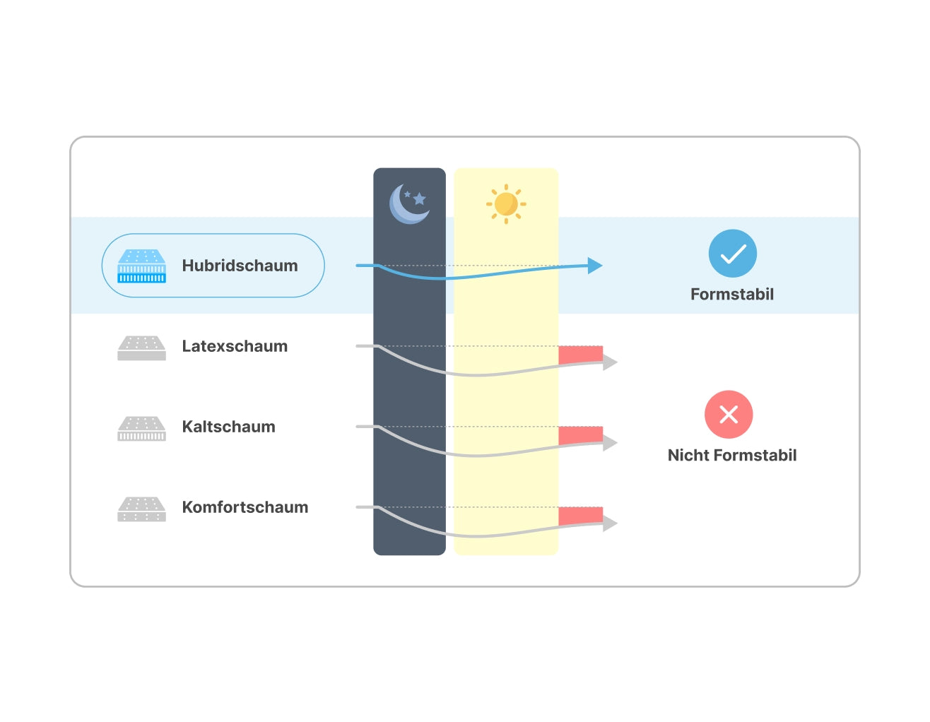 - Eine Hybridmatratze kombiniert verschiedene Matratzentechnologien, in der Regel Memory-Schaum und Federkern, um das Beste aus beiden Welten zu bieten. Der Memory-Schaum passt sich Ihren Körperkonturen an und sorgt für eine individuelle Druckentlastung, während der Federkern eine stabile Unterstützung und Langlebigkeit gewährleistet. Diese Kombination sorgt für eine optimale Ausrichtung der Wirbelsäule, erhöht die Luftzirkulation für bessere Temperaturregulierung und minimiert Bewegungsübertragungen – ideal für ungestörten Schlaf, auch wenn Ihr Partner sich bewegt.